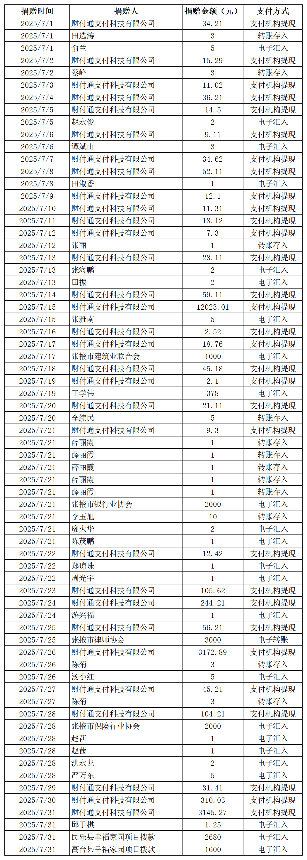 2025年張掖市慈善協(xié)會積極搭建愛心平臺,得到廣大愛心人士和愛心單位積極響應(yīng),踴躍捐款捐物,現(xiàn)將(2025年7月1日--7月31日)接收到的銀行轉(zhuǎn)賬收入公示如下: