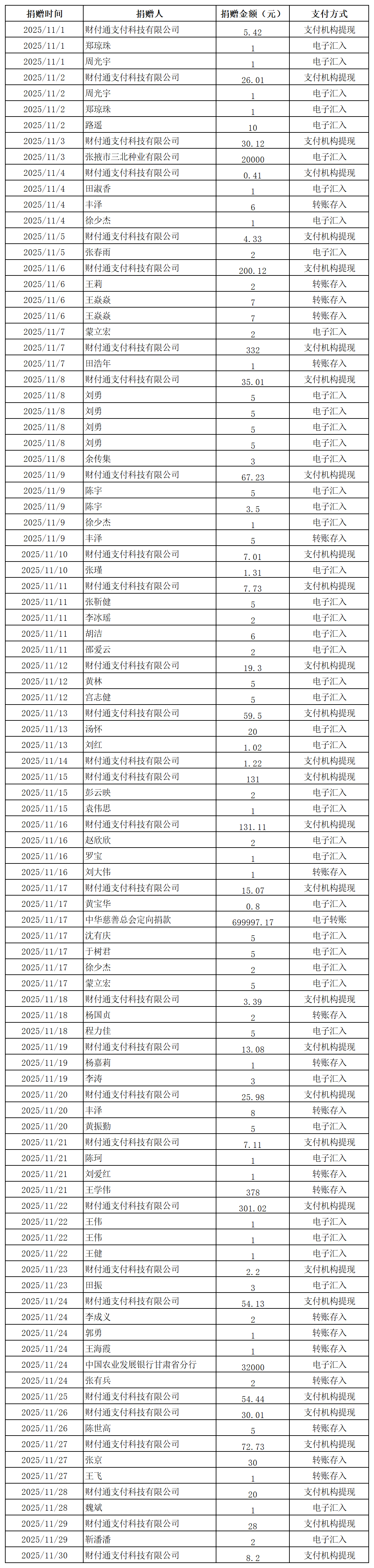 2025年張掖市慈善協(xié)會積極搭建愛心平臺,得到廣大愛心人士和愛心單位積極響應,踴躍捐款捐物,現(xiàn)將(2025年11月1日--11月30日)接收到的銀行轉賬收入公示如下: