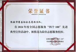 7月,協(xié)會被中央社會工作部、民政部等21個(gè)部門推選為全國志愿服務(wù)“四個(gè)100”最佳志愿服務(wù)組織;11月,榮獲民政部第五次“全國先進(jìn)社會組織”稱號;12月,連續(xù)榮獲甘肅省慈善聯(lián)合總會“全省慈善工作先進(jìn)單位”;張掖慈善成為甘肅公益慈善領(lǐng)域的亮麗名片。